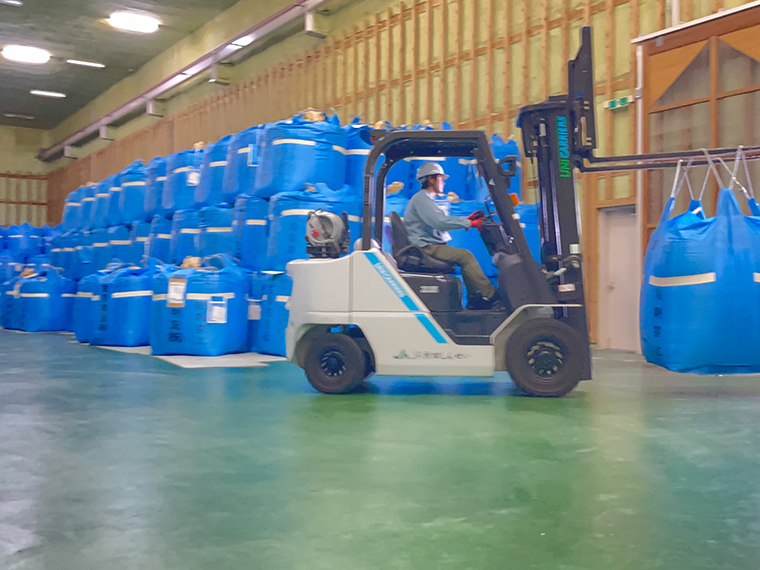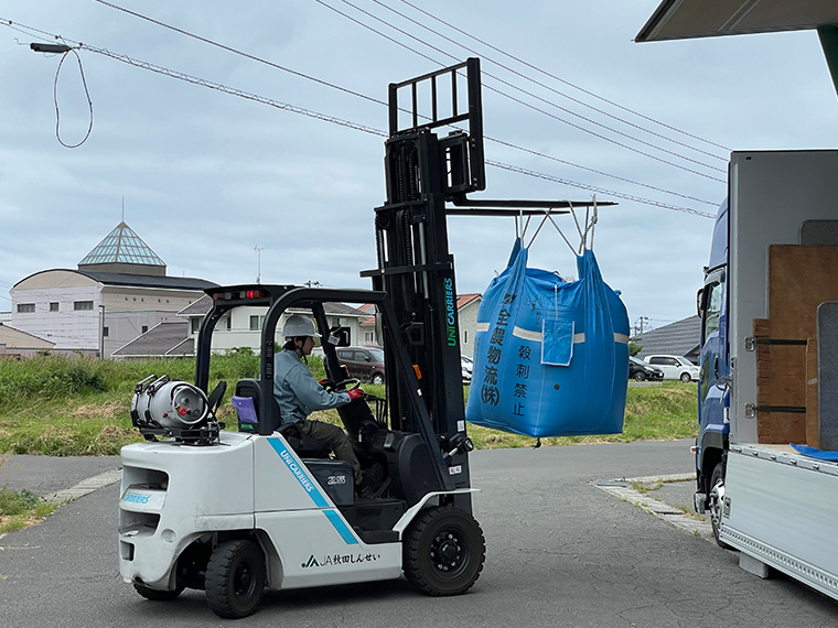 倉庫内ではフォークリフトで米を運搬するので、紙袋を破らない事、人がいないかの確認など細心の注意を払って業務にあたっています。