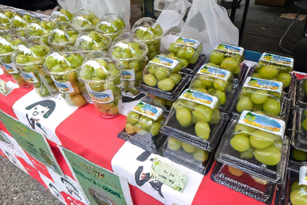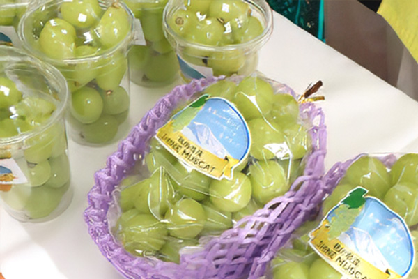 栽培用研修ハウスで収穫されたシャインマスカットは、県内外の各種イベントでのPR販売のほか、JA本店のロビーにて直売会を行っています。
